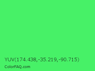 YUV 174.438,-35.219,-90.715 Color is a light green color and the nearest color is Screamin Green #66ff66. Hex code #47f167 and RGB value is rgb(71,241,103). In RGB color space, this color is composed of 28% red, 95% green, 40% blue, In CMYK color space, this color is composed of 71% cyan, 0% magenta, 57% yellow , 5% black , In HSL color space, this color has a hue angle of 131° , 86% saturation and 61% lightness.