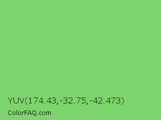 YUV 174.43,-32.75,-42.473 Color is a light green color and the nearest color is Pastel Green #77dd77. Hex code #7ed46c and RGB value is rgb(126,212,108). In RGB color space, this color is composed of 49% red, 83% green, 42% blue, In CMYK color space, this color is composed of 41% cyan, 0% magenta, 49% yellow , 17% black , In HSL color space, this color has a hue angle of 110° , 55% saturation and 63% lightness.