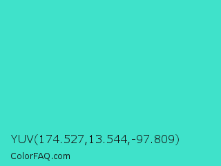 YUV 174.527,13.544,-97.809 Color is a normal cyan color and the nearest color is Turquoise #40e0d0. Hex code #3fe2ca and RGB value is rgb(63,226,202). In RGB color space, this color is composed of 25% red, 89% green, 79% blue, In CMYK color space, this color is composed of 72% cyan, 0% magenta, 11% yellow , 11% black , In HSL color space, this color has a hue angle of 171° , 74% saturation and 57% lightness.
