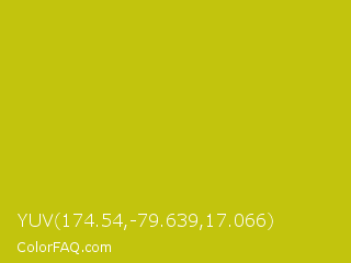 YUV 174.54,-79.639,17.066 Color is a normal yellow color and the nearest color is Rio Grande #bbd009. Hex code #c2c40d and RGB value is rgb(194,196,13). In RGB color space, this color is composed of 76% red, 77% green, 5% blue, In CMYK color space, this color is composed of 1% cyan, 0% magenta, 93% yellow , 23% black , In HSL color space, this color has a hue angle of 61° , 88% saturation and 41% lightness.