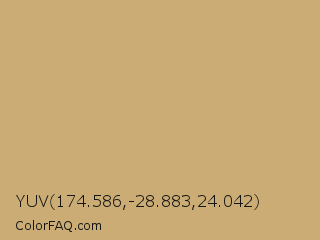YUV 174.586,-28.883,24.042 Color is a light orange color and the nearest color is Light French Beige #c8ad7f. Hex code #caac74 and RGB value is rgb(202,172,116). In RGB color space, this color is composed of 79% red, 67% green, 45% blue, In CMYK color space, this color is composed of 0% cyan, 15% magenta, 43% yellow , 21% black , In HSL color space, this color has a hue angle of 39° , 45% saturation and 62% lightness.