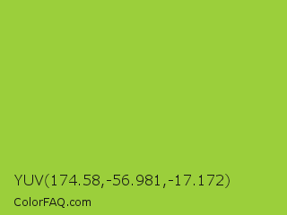 YUV 174.58,-56.981,-17.172 Color is a normal green color and the nearest color is Yellow Green #9acd32. Hex code #9bcf3b and RGB value is rgb(155,207,59). In RGB color space, this color is composed of 61% red, 81% green, 23% blue, In CMYK color space, this color is composed of 25% cyan, 0% magenta, 71% yellow , 19% black , In HSL color space, this color has a hue angle of 81° , 61% saturation and 52% lightness.