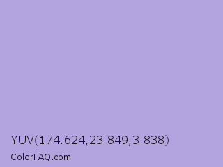 YUV 174.624,23.849,3.838 Color is a light indigo color and the nearest color is Light Pastel Purple #b19cd9. Hex code #b3a3df and RGB value is rgb(179,163,223). In RGB color space, this color is composed of 70% red, 64% green, 87% blue, In CMYK color space, this color is composed of 20% cyan, 27% magenta, 0% yellow , 13% black , In HSL color space, this color has a hue angle of 256° , 48% saturation and 76% lightness.