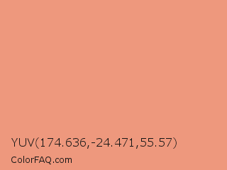 YUV 174.636,-24.471,55.57 Color is a light red color and the nearest color is Dark Salmon #e9967a. Hex code #ee987d and RGB value is rgb(238,152,125). In RGB color space, this color is composed of 93% red, 60% green, 49% blue, In CMYK color space, this color is composed of 0% cyan, 36% magenta, 47% yellow , 7% black , In HSL color space, this color has a hue angle of 14° , 77% saturation and 71% lightness.