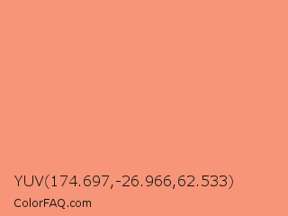 YUV 174.697,-26.966,62.533 Color is a light red color and the nearest color is Apricot #eb9373. Hex code #f69578 and RGB value is rgb(246,149,120). In RGB color space, this color is composed of 96% red, 58% green, 47% blue, In CMYK color space, this color is composed of 0% cyan, 39% magenta, 51% yellow , 4% black , In HSL color space, this color has a hue angle of 14° , 88% saturation and 72% lightness.
