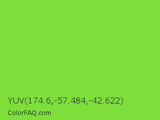 YUV 174.6,-57.484,-42.622 Color is a normal green color and the nearest color is Kiwi #8ee53f. Hex code #7ede3a and RGB value is rgb(126,222,58). In RGB color space, this color is composed of 49% red, 87% green, 23% blue, In CMYK color space, this color is composed of 43% cyan, 0% magenta, 74% yellow , 13% black , In HSL color space, this color has a hue angle of 95° , 71% saturation and 55% lightness.
