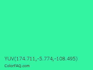 YUV 174.711,-5.774,-108.495 Color is a normal green color and the nearest color is Eucalyptus #44d7a8. Hex code #33f0a3 and RGB value is rgb(51,240,163). In RGB color space, this color is composed of 20% red, 94% green, 64% blue, In CMYK color space, this color is composed of 79% cyan, 0% magenta, 32% yellow , 6% black , In HSL color space, this color has a hue angle of 156° , 86% saturation and 57% lightness.