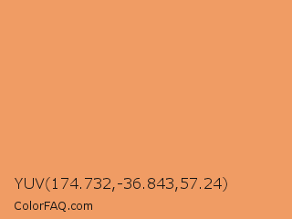 YUV 174.732,-36.843,57.24 Color is a light orange color and the nearest color is Sandy Brown #f4a460. Hex code #f09c64 and RGB value is rgb(240,156,100). In RGB color space, this color is composed of 94% red, 61% green, 39% blue, In CMYK color space, this color is composed of 0% cyan, 35% magenta, 58% yellow , 6% black , In HSL color space, this color has a hue angle of 24° , 82% saturation and 67% lightness.
