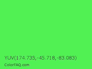 YUV 174.735,-45.718,-83.083 Color is a light green color and the nearest color is Screamin Green #66ff66. Hex code #50f152 and RGB value is rgb(80,241,82). In RGB color space, this color is composed of 31% red, 95% green, 32% blue, In CMYK color space, this color is composed of 67% cyan, 0% magenta, 66% yellow , 5% black , In HSL color space, this color has a hue angle of 121° , 85% saturation and 63% lightness.
