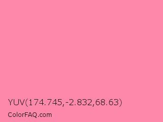 YUV 174.745,-2.832,68.63 Color is a light rose color and the nearest color is Tickle Me Pink #fc89ac. Hex code #fd88a9 and RGB value is rgb(253,136,169). In RGB color space, this color is composed of 99% red, 53% green, 66% blue, In CMYK color space, this color is composed of 0% cyan, 46% magenta, 33% yellow , 1% black , In HSL color space, this color has a hue angle of 343° , 97% saturation and 76% lightness.