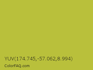 YUV 174.745,-57.062,8.994 Color is a normal yellow color and the nearest color is Earls Green #c9b93b. Hex code #b9c03b and RGB value is rgb(185,192,59). In RGB color space, this color is composed of 73% red, 75% green, 23% blue, In CMYK color space, this color is composed of 4% cyan, 0% magenta, 69% yellow , 25% black , In HSL color space, this color has a hue angle of 63° , 53% saturation and 49% lightness.