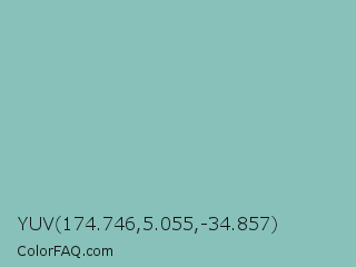 YUV 174.746,5.055,-34.857 Color is a light cyan color and the nearest color is Neptune #7cb7bb. Hex code #87c1b9 and RGB value is rgb(135,193,185). In RGB color space, this color is composed of 53% red, 76% green, 73% blue, In CMYK color space, this color is composed of 30% cyan, 0% magenta, 4% yellow , 24% black , In HSL color space, this color has a hue angle of 172° , 32% saturation and 64% lightness.