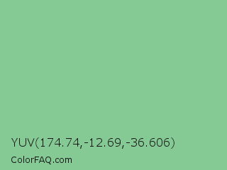 YUV 174.74,-12.69,-36.606 Color is a light green color and the nearest color is Dark Sea Green #8fbc8f. Hex code #85c995 and RGB value is rgb(133,201,149). In RGB color space, this color is composed of 52% red, 79% green, 58% blue, In CMYK color space, this color is composed of 34% cyan, 0% magenta, 26% yellow , 21% black , In HSL color space, this color has a hue angle of 134° , 39% saturation and 65% lightness.