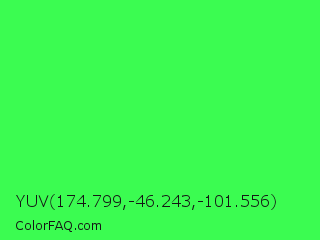 YUV 174.799,-46.243,-101.556 Color is a light green color and the nearest color is Screamin Green #66ff66. Hex code #3bfc51 and RGB value is rgb(59,252,81). In RGB color space, this color is composed of 23% red, 99% green, 32% blue, In CMYK color space, this color is composed of 77% cyan, 0% magenta, 68% yellow , 1% black , In HSL color space, this color has a hue angle of 127° , 97% saturation and 61% lightness.