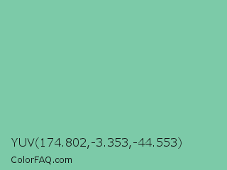 YUV 174.802,-3.353,-44.553 Color is a light green color and the nearest color is Gulf Stream #80b3ae. Hex code #7ccaa8 and RGB value is rgb(124,202,168). In RGB color space, this color is composed of 49% red, 79% green, 66% blue, In CMYK color space, this color is composed of 39% cyan, 0% magenta, 17% yellow , 21% black , In HSL color space, this color has a hue angle of 154° , 42% saturation and 64% lightness.