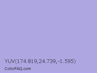 YUV 174.819,24.739,-1.595 Color is a light indigo color and the nearest color is Maximum Blue Purple #acace6. Hex code #ada6e1 and RGB value is rgb(173,166,225). In RGB color space, this color is composed of 68% red, 65% green, 88% blue, In CMYK color space, this color is composed of 23% cyan, 26% magenta, 0% yellow , 12% black , In HSL color space, this color has a hue angle of 247° , 50% saturation and 77% lightness.
