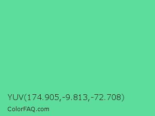 YUV 174.905,-9.813,-72.708 Color is a light green color and the nearest color is Medium Aquamarine #66ddaa. Hex code #5cdd9b and RGB value is rgb(92,221,155). In RGB color space, this color is composed of 36% red, 87% green, 61% blue, In CMYK color space, this color is composed of 58% cyan, 0% magenta, 30% yellow , 13% black , In HSL color space, this color has a hue angle of 149° , 65% saturation and 61% lightness.