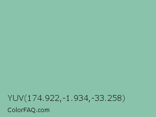 YUV 174.922,-1.934,-33.258 Color is a light green color and the nearest color is Summer Green #96bbab. Hex code #89c3ab and RGB value is rgb(137,195,171). In RGB color space, this color is composed of 54% red, 76% green, 67% blue, In CMYK color space, this color is composed of 30% cyan, 0% magenta, 12% yellow , 24% black , In HSL color space, this color has a hue angle of 155° , 33% saturation and 65% lightness.