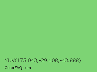 YUV 175.043,-29.108,-43.888 Color is a light green color and the nearest color is Pastel Green #77dd77. Hex code #7dd474 and RGB value is rgb(125,212,116). In RGB color space, this color is composed of 49% red, 83% green, 45% blue, In CMYK color space, this color is composed of 41% cyan, 0% magenta, 45% yellow , 17% black , In HSL color space, this color has a hue angle of 114° , 53% saturation and 64% lightness.