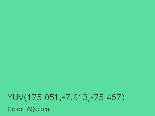 YUV 175.051,-7.913,-75.467 Color is a light green color and the nearest color is Medium Aquamarine #66ddaa. Hex code #59de9f and RGB value is rgb(89,222,159). In RGB color space, this color is composed of 35% red, 87% green, 62% blue, In CMYK color space, this color is composed of 60% cyan, 0% magenta, 28% yellow , 13% black , In HSL color space, this color has a hue angle of 152° , 67% saturation and 61% lightness.