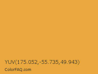 YUV 175.052,-55.735,49.943 Color is a normal orange color and the nearest color is Tulip Tree #eab33b. Hex code #e8a83e and RGB value is rgb(232,168,62). In RGB color space, this color is composed of 91% red, 66% green, 24% blue, In CMYK color space, this color is composed of 0% cyan, 28% magenta, 73% yellow , 9% black , In HSL color space, this color has a hue angle of 37° , 79% saturation and 58% lightness.