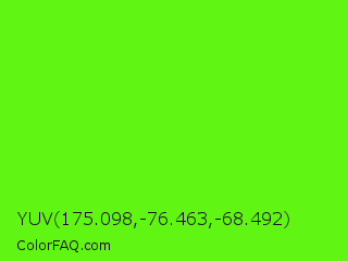 YUV 175.098,-76.463,-68.492 Color is a normal green color and the nearest color is Bright Green #66ff00. Hex code #61f514 and RGB value is rgb(97,245,20). In RGB color space, this color is composed of 38% red, 96% green, 8% blue, In CMYK color space, this color is composed of 60% cyan, 0% magenta, 92% yellow , 4% black , In HSL color space, this color has a hue angle of 99° , 92% saturation and 52% lightness.