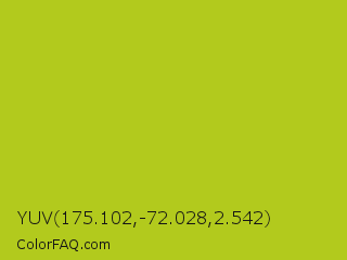 YUV 175.102,-72.028,2.542 Color is a normal yellow color and the nearest color is Acid Green #b0bf1a. Hex code #b2ca1d and RGB value is rgb(178,202,29). In RGB color space, this color is composed of 70% red, 79% green, 11% blue, In CMYK color space, this color is composed of 12% cyan, 0% magenta, 86% yellow , 21% black , In HSL color space, this color has a hue angle of 68° , 75% saturation and 45% lightness.