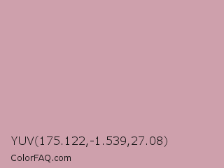 YUV 175.122,-1.539,27.08 Color is a light rose color and the nearest color is Careys Pink #d29eaa. Hex code #cea0ac and RGB value is rgb(206,160,172). In RGB color space, this color is composed of 81% red, 63% green, 67% blue, In CMYK color space, this color is composed of 0% cyan, 22% magenta, 17% yellow , 19% black , In HSL color space, this color has a hue angle of 344° , 32% saturation and 72% lightness.