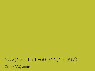 YUV 175.154,-60.715,13.897 Color is a normal yellow color and the nearest color is Earls Green #c9b93b. Hex code #bfbf34 and RGB value is rgb(191,191,52). In RGB color space, this color is composed of 75% red, 75% green, 20% blue, In CMYK color space, this color is composed of 0% cyan, 0% magenta, 73% yellow , 25% black , In HSL color space, this color has a hue angle of 60° , 57% saturation and 48% lightness.