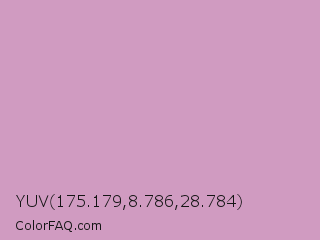 YUV 175.179,8.786,28.784 Color is a light magenta color and the nearest color is Pastel Violet #cb99c9. Hex code #d09bc1 and RGB value is rgb(208,155,193). In RGB color space, this color is composed of 82% red, 61% green, 76% blue, In CMYK color space, this color is composed of 0% cyan, 25% magenta, 7% yellow , 18% black , In HSL color space, this color has a hue angle of 317° , 36% saturation and 71% lightness.