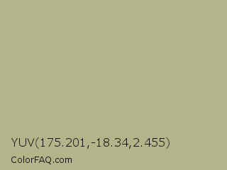 YUV 175.201,-18.34,2.455 Color is a light yellow color and the nearest color is Swamp Green #acb78e. Hex code #b2b58a and RGB value is rgb(178,181,138). In RGB color space, this color is composed of 70% red, 71% green, 54% blue, In CMYK color space, this color is composed of 2% cyan, 0% magenta, 24% yellow , 29% black , In HSL color space, this color has a hue angle of 64° , 23% saturation and 63% lightness.