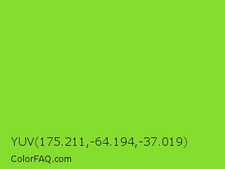 YUV 175.211,-64.194,-37.019 Color is a normal green color and the nearest color is Kiwi #8ee53f. Hex code #85de2d and RGB value is rgb(133,222,45). In RGB color space, this color is composed of 52% red, 87% green, 18% blue, In CMYK color space, this color is composed of 40% cyan, 0% magenta, 80% yellow , 13% black , In HSL color space, this color has a hue angle of 90° , 73% saturation and 52% lightness.