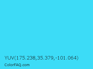 YUV 175.238,35.379,-101.064 Color is a normal cyan color and the nearest color is Turquoise #40e0d0. Hex code #3cdcf7 and RGB value is rgb(60,220,247). In RGB color space, this color is composed of 24% red, 86% green, 97% blue, In CMYK color space, this color is composed of 76% cyan, 11% magenta, 0% yellow , 3% black , In HSL color space, this color has a hue angle of 189° , 92% saturation and 60% lightness.