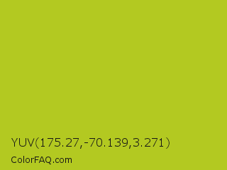 YUV 175.27,-70.139,3.271 Color is a normal yellow color and the nearest color is Key Lime Pie #bfc921. Hex code #b3c921 and RGB value is rgb(179,201,33). In RGB color space, this color is composed of 70% red, 79% green, 13% blue, In CMYK color space, this color is composed of 11% cyan, 0% magenta, 84% yellow , 21% black , In HSL color space, this color has a hue angle of 68° , 72% saturation and 46% lightness.