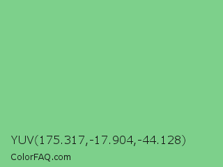 YUV 175.317,-17.904,-44.128 Color is a light green color and the nearest color is De York #7ac488. Hex code #7dd08b and RGB value is rgb(125,208,139). In RGB color space, this color is composed of 49% red, 82% green, 55% blue, In CMYK color space, this color is composed of 40% cyan, 0% magenta, 33% yellow , 18% black , In HSL color space, this color has a hue angle of 130° , 47% saturation and 65% lightness.