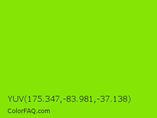 YUV 175.347,-83.981,-37.138 Color is a normal green color and the nearest color is Alien Armpit #84de02. Hex code #85e605 and RGB value is rgb(133,230,5). In RGB color space, this color is composed of 52% red, 90% green, 2% blue, In CMYK color space, this color is composed of 42% cyan, 0% magenta, 98% yellow , 10% black , In HSL color space, this color has a hue angle of 86° , 96% saturation and 46% lightness.