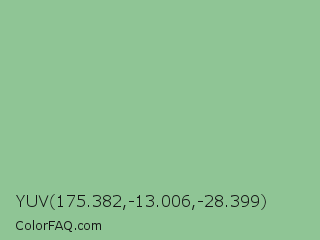 YUV 175.382,-13.006,-28.399 Color is a light green color and the nearest color is Dark Sea Green #8fbc8f. Hex code #8fc595 and RGB value is rgb(143,197,149). In RGB color space, this color is composed of 56% red, 77% green, 58% blue, In CMYK color space, this color is composed of 27% cyan, 0% magenta, 24% yellow , 23% black , In HSL color space, this color has a hue angle of 127° , 32% saturation and 67% lightness.