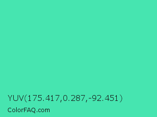 YUV 175.417,0.287,-92.451 Color is a normal green color and the nearest color is Eucalyptus #44d7a8. Hex code #46e5b0 and RGB value is rgb(70,229,176). In RGB color space, this color is composed of 27% red, 90% green, 69% blue, In CMYK color space, this color is composed of 69% cyan, 0% magenta, 23% yellow , 10% black , In HSL color space, this color has a hue angle of 160° , 75% saturation and 59% lightness.