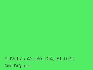 YUV 175.45,-36.704,-81.079 Color is a light green color and the nearest color is Screamin Green #66ff66. Hex code #53ed65 and RGB value is rgb(83,237,101). In RGB color space, this color is composed of 33% red, 93% green, 40% blue, In CMYK color space, this color is composed of 65% cyan, 0% magenta, 57% yellow , 7% black , In HSL color space, this color has a hue angle of 127° , 81% saturation and 63% lightness.