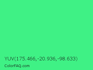 YUV 175.466,-20.936,-98.633 Color is a normal green color and the nearest color is Very Light Malachite Green #64e986. Hex code #3ff185 and RGB value is rgb(63,241,133). In RGB color space, this color is composed of 25% red, 95% green, 52% blue, In CMYK color space, this color is composed of 74% cyan, 0% magenta, 45% yellow , 5% black , In HSL color space, this color has a hue angle of 144° , 86% saturation and 60% lightness.