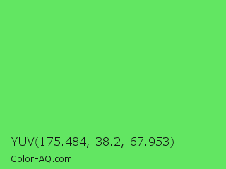 YUV 175.484,-38.2,-67.953 Color is a light green color and the nearest color is Screamin Green #66ff66. Hex code #62e662 and RGB value is rgb(98,230,98). In RGB color space, this color is composed of 38% red, 90% green, 38% blue, In CMYK color space, this color is composed of 57% cyan, 0% magenta, 57% yellow , 10% black , In HSL color space, this color has a hue angle of 120° , 73% saturation and 64% lightness.