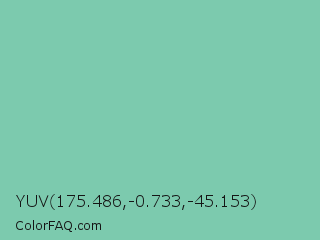 YUV 175.486,-0.733,-45.153 Color is a light green color and the nearest color is Neptune #7cb7bb. Hex code #7ccaae and RGB value is rgb(124,202,174). In RGB color space, this color is composed of 49% red, 79% green, 68% blue, In CMYK color space, this color is composed of 39% cyan, 0% magenta, 14% yellow , 21% black , In HSL color space, this color has a hue angle of 158° , 42% saturation and 64% lightness.