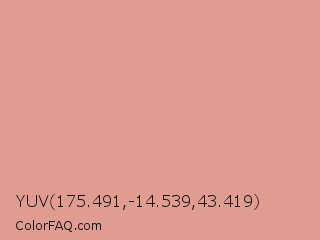 YUV 175.491,-14.539,43.419 Color is a light red color and the nearest color is Petite Orchid #db9690. Hex code #e19c92 and RGB value is rgb(225,156,146). In RGB color space, this color is composed of 88% red, 61% green, 57% blue, In CMYK color space, this color is composed of 0% cyan, 31% magenta, 35% yellow , 12% black , In HSL color space, this color has a hue angle of 8° , 57% saturation and 73% lightness.
