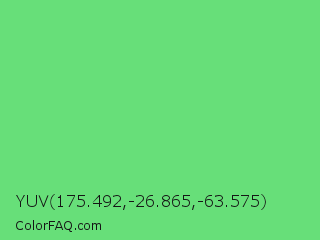 YUV 175.492,-26.865,-63.575 Color is a light green color and the nearest color is Pastel Green #77dd77. Hex code #67df79 and RGB value is rgb(103,223,121). In RGB color space, this color is composed of 40% red, 87% green, 47% blue, In CMYK color space, this color is composed of 54% cyan, 0% magenta, 46% yellow , 13% black , In HSL color space, this color has a hue angle of 129° , 65% saturation and 64% lightness.