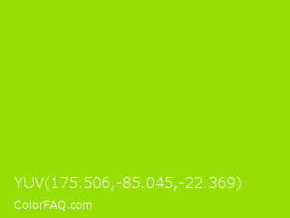 YUV 175.506,-85.045,-22.369 Color is a normal green color and the nearest color is Sheen Green #8fd400. Hex code #96de03 and RGB value is rgb(150,222,3). In RGB color space, this color is composed of 59% red, 87% green, 1% blue, In CMYK color space, this color is composed of 32% cyan, 0% magenta, 99% yellow , 13% black , In HSL color space, this color has a hue angle of 80° , 97% saturation and 44% lightness.