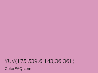 YUV 175.539,6.143,36.361 Color is a light magenta color and the nearest color is Shocking #e292c0. Hex code #d998bc and RGB value is rgb(217,152,188). In RGB color space, this color is composed of 85% red, 60% green, 74% blue, In CMYK color space, this color is composed of 0% cyan, 30% magenta, 13% yellow , 15% black , In HSL color space, this color has a hue angle of 327° , 46% saturation and 72% lightness.