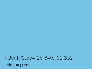 YUV 175.554,26.349,-51.352 Color is a light blue color and the nearest color is Aero #7cb9e8. Hex code #75c3e5 and RGB value is rgb(117,195,229). In RGB color space, this color is composed of 46% red, 76% green, 90% blue, In CMYK color space, this color is composed of 49% cyan, 15% magenta, 0% yellow , 10% black , In HSL color space, this color has a hue angle of 198° , 68% saturation and 68% lightness.