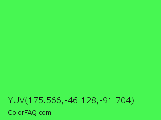 YUV 175.566,-46.128,-91.704 Color is a light green color and the nearest color is Screamin Green #66ff66. Hex code #47f752 and RGB value is rgb(71,247,82). In RGB color space, this color is composed of 28% red, 97% green, 32% blue, In CMYK color space, this color is composed of 71% cyan, 0% magenta, 67% yellow , 3% black , In HSL color space, this color has a hue angle of 124° , 92% saturation and 62% lightness.