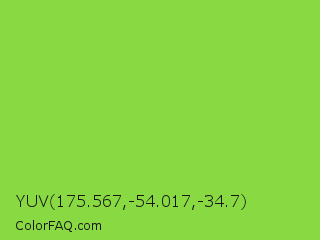 YUV 175.567,-54.017,-34.7 Color is a normal green color and the nearest color is Kiwi #8ee53f. Hex code #88d942 and RGB value is rgb(136,217,66). In RGB color space, this color is composed of 53% red, 85% green, 26% blue, In CMYK color space, this color is composed of 37% cyan, 0% magenta, 70% yellow , 15% black , In HSL color space, this color has a hue angle of 92° , 67% saturation and 55% lightness.