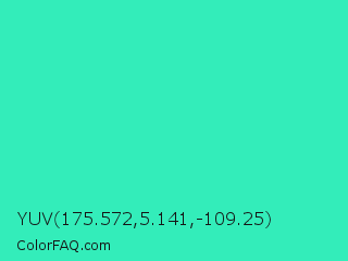 YUV 175.572,5.141,-109.25 Color is a normal cyan color and the nearest color is Turquoise PWG #30d5c8. Hex code #33edba and RGB value is rgb(51,237,186). In RGB color space, this color is composed of 20% red, 93% green, 73% blue, In CMYK color space, this color is composed of 78% cyan, 0% magenta, 22% yellow , 7% black , In HSL color space, this color has a hue angle of 164° , 84% saturation and 56% lightness.